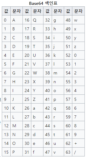 위와 같이 chars 문자열로 맵핑해서 인코딩을 하는 것이다. 정확히는 base 64 표라고 하면 되겠다.